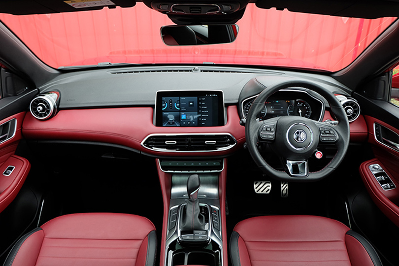 The interior of the MG HS 1.5 X in the top X trim feels premium, soft-touch materials, and leather upholstery creating a luxurious atmosphere.
